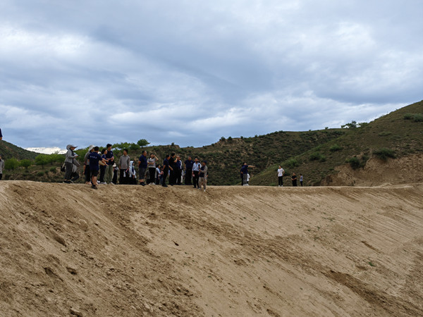 中游科考队调研榆林市佳县朱官寨镇冯家圪崂村正在修建的中型拦沙坝。