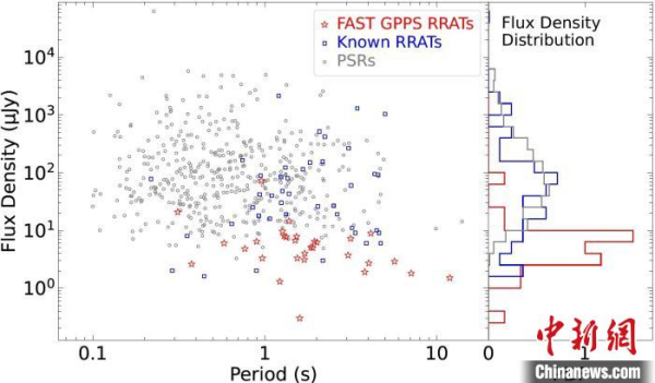“中国天眼”新发现的和已知旋转射电暂现源RRAT与普通脉冲星相比,流量低约一个量级。中国科学院国家天文台 供图