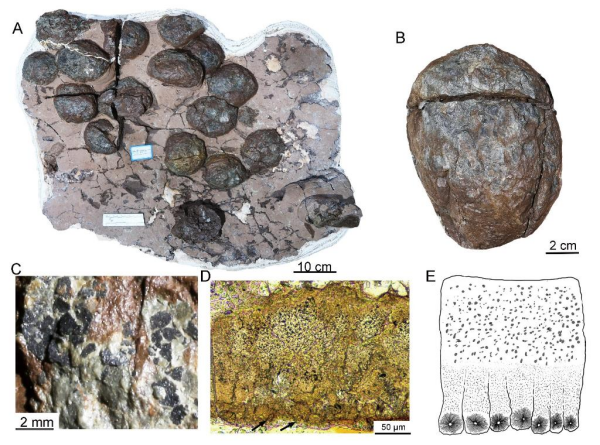 图为守护黔龙的蛋窝和蛋壳结构。A. 清理后的恐龙蛋窝;B. 一枚保存较完整的守护黔龙蛋;C. 蛋壳碎片;蛋壳显微结构(D)和素描图(E)。韩凤禄供图