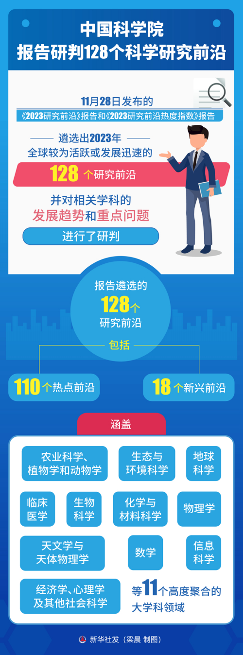 11月28日发布的《2023研究前沿》报告和《2023研究前沿热度指数》报告,遴选出2023年全球较为活跃或发展迅速的128个研究前沿,并对相关学科的发展趋势和重点问题进行了研判。