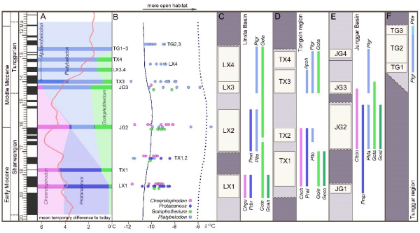 中国北方早–中中新世三类长颌象的相对丰度、牙釉质同位素值以及不同地点象类化石组合和相应的生物年代(图源:李春晓)。中国科学院古脊椎所供图