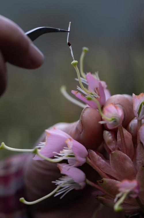在华西亚高山植物园,研究人员李烨将火红杜鹃的花粉人工授粉到峨眉杜鹃的柱头上(4月17日摄)。