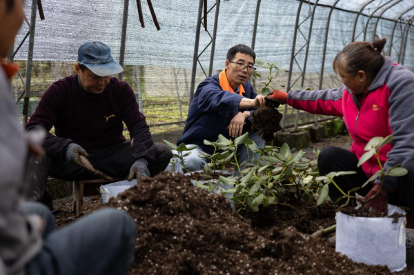 在华西亚高山植物园,园丁们准备移栽杜鹃树苗,研究人员王飞(右二)在查看附着在杜鹃根系上的土壤(4月17日摄)。