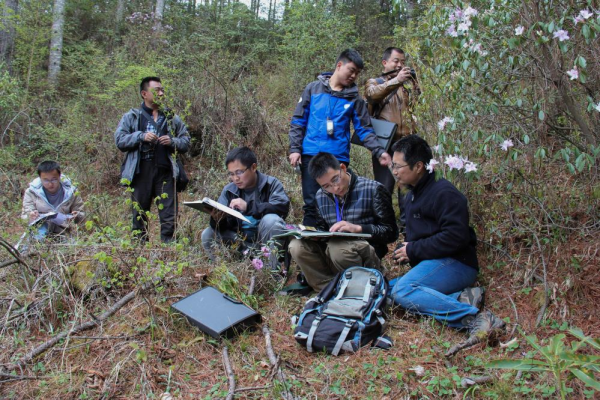 华西亚高山植物园研究人员王飞(前左二)在泸定县二郎山进行杜鹃花野外调查工作(2018年5月9日摄)。新华社发