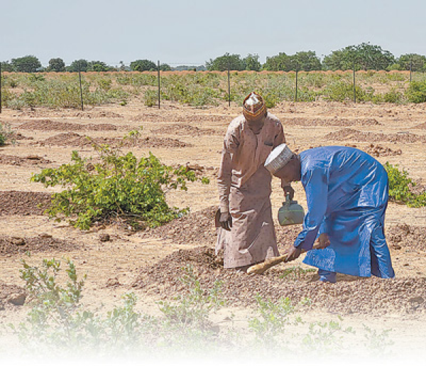在尼日利亚卡诺州,中国科学院新疆生态与地理研究所同尼日利亚非洲荒漠化控制倡议组织合作开展治沙项目。图为当地工作人员在项目上管理维护。新华社记者 郭骏摄