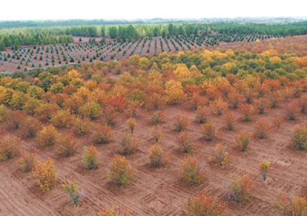 在哈萨克斯坦首都阿斯塔纳,中国科学院新疆生态与地理研究所与哈萨克斯坦塞富林农业技术大学等机构展开合作,建成23公顷的绿化示范区。图为阿斯塔纳一处苗圃(无人机照片)。法尔哈特·图克诺夫摄(新华社发)