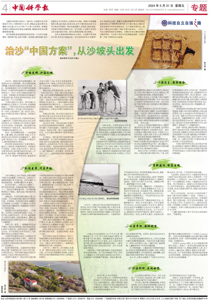 在这片沙漠之中,中国科学院和相关单位的一代代科学家传承接力,倾注无数心血,反复试验研究。他们不断摸索,提出“以固为主、固阻结合”的沙漠铁路防护体系建设理论与模式,指引和保护包兰铁路在风沙肆虐中畅通60余年。