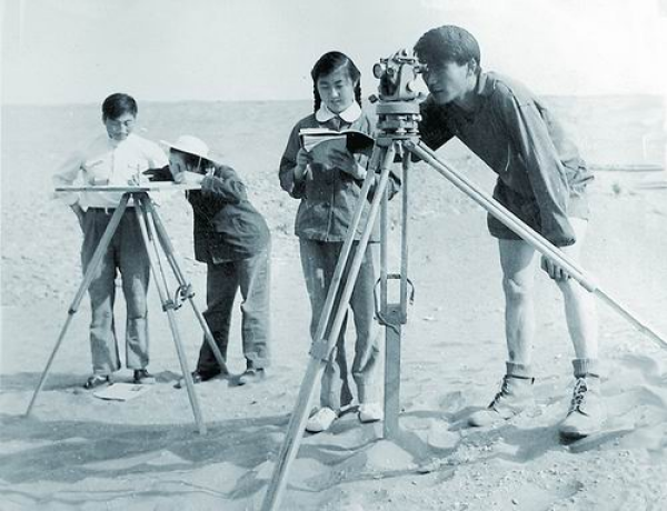 20世纪60年代初,沙坡头站科研人员进行野外测量。西北研究院供图