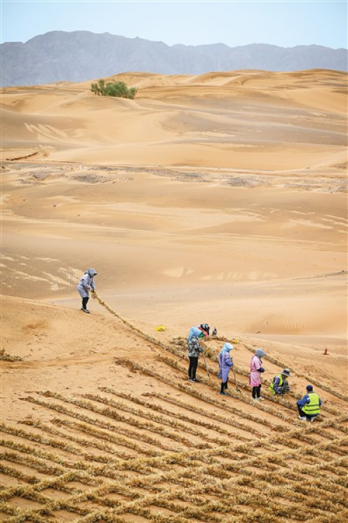 图为治沙工人在宁夏中卫市境内的腾格里沙漠铺设刷状网绳式草方格沙障。新华社记者冯开华摄