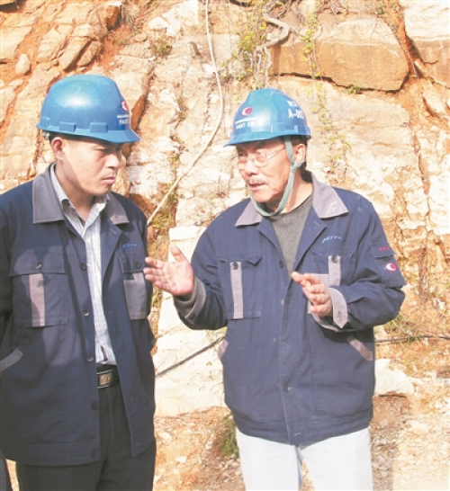 南仁东(右)在贵州黔南州平塘县大窝凼施工现场与工程技术人员在一起。新华社发