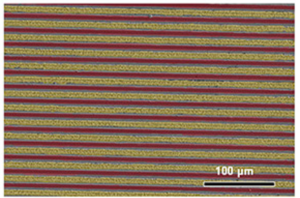 刘岗团队的研究人员受此启发,结合微纳集成工艺,在氟掺杂氧化锡(FTO)透明导电玻璃上创制了“人工树叶”,即图案化的新型仿生光催化材料面板,获得Cu2O(产氢光催化材料)与BiVO4(产氧光催化材料)两种半导体间隔交替分布的条带图案。通过匹配半导体与导电基体间的功函数,形成欧姆接触促进二者间通过导电基体进行Z型电荷转移,有效抑制光生电子与空穴的发光复合,延长光生电荷的平均寿命,并实现光生电子与空穴的空间有序分离,即分别在产氢和产氧光催化材料条带上有序富集。由此,可见光照射下有序富集的光生电子与空穴可自发裂解水,产生化学计量比的氢气和氧气。