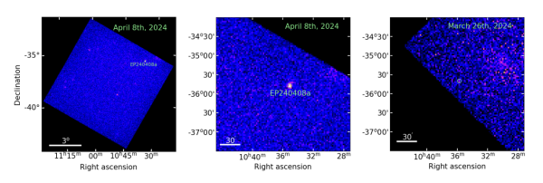 图为“天关” 宽视场X射线望远镜在发现EP240408a的观测中获得的X射线图像:整个探测器上的探测图像(左侧图)以及局部放大的图像(中间图)。此外,还展示了在发现EP240408a约13天前的观测中,在该源方位处的X射线图像以供对比(右侧图)。在所有图像中,源的定位误差(3角分)标记为绿色圆圈,位于EP240408a的位置。