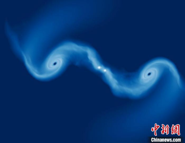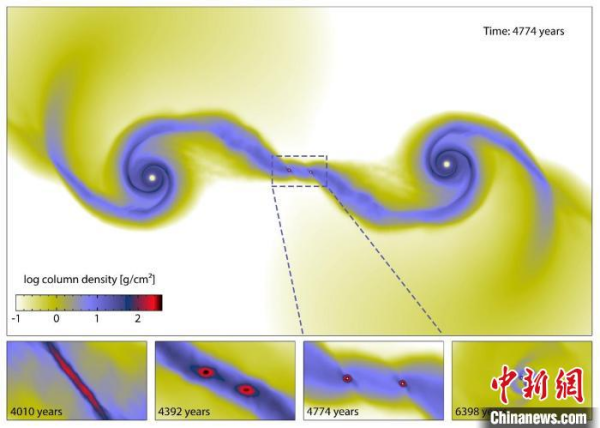 相遇星周盘之间形成“潮汐桥”并坍缩形成流浪行星质量天体双星的三维流体力学模拟示例。中国科学院上海天文台 供图