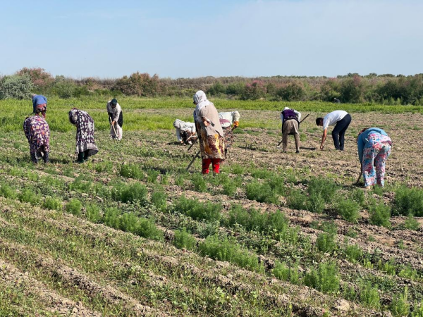 6月3日,位于乌兹别克斯坦穆伊纳克镇的咸海国际创新中心试验示范园区内,当地农户在与中国科学院新疆生地所合作共建的“光伏+生态”盐生植物园里劳作。(受访者供图)