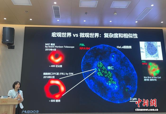 中国科学院分子细胞科学卓越创新中心研究员陈玲玲24日在上海接受采访时展示了一组照片,一张是事件视界望远镜(EHT)于2019年4月发布的人类首张黑洞照片——M87黑洞,该黑洞事件视界直径为400亿公里;另一张是2018年2月,陈玲玲团队拍摄到的细胞核仁DFC(致密纤维组分)层图像,其直径为600纳米。