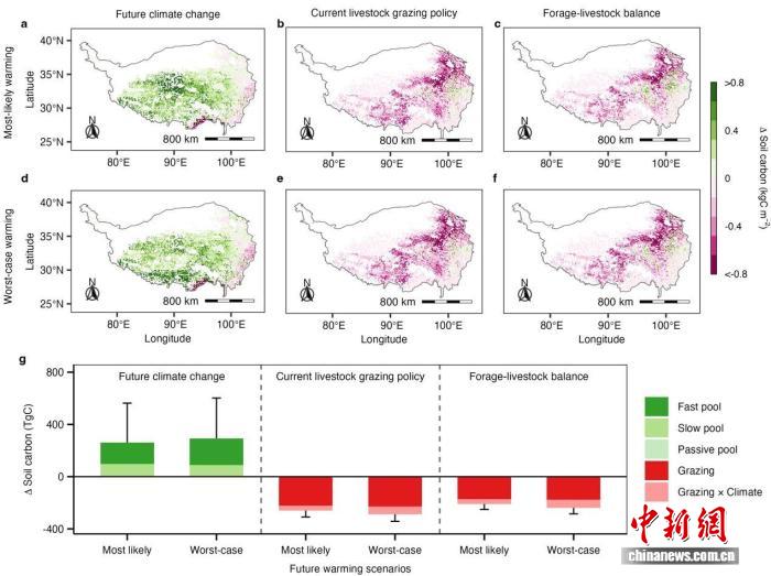 据研究团队粗略估算,极端热融事件将抵消一半以上气候变暖带来的碳增益;若延续历史放牧管理模式,过度放牧引起的碳损失几乎完全抵消气候变暖带来的碳增益;在实施草畜平衡管理政策的情境下,放牧仍造成土壤碳损失,但其负面影响将减弱。