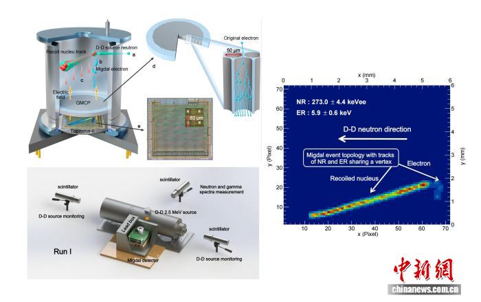 在本项研究中,中国科学家团队自主研发出“微结构气体探测器+像素读出芯片”组合的超灵敏探测装置,相当于可拍摄“单原子运动中释放电子过程”的“照相机”。利用紧凑型氘-氘聚变反应加速器中子源,轰击“照相机”内的气体分子,会同时产生原子核反冲与米格达尔电子,二者形成“共顶点”的独特轨迹。