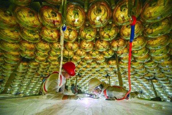 此时,他们脚下,我国新一代大型中微子实验装置——江门中微子实验已建成运行。它的核心探测器主支承结构是一个直径41.1米的不锈钢网壳,里面装着直径35.4米的巨型有机玻璃球,球里装着让中微子现身的2万吨液体闪烁体,有机玻璃球则泡在4万吨超纯水中。探测器里还有2万只20英寸光电倍增管、2.5万只3英寸光电倍增管……