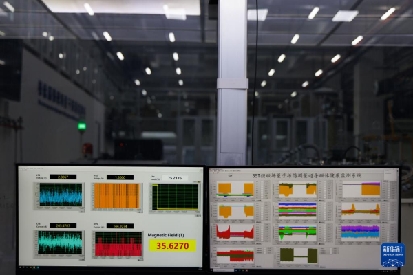 1月26日,在位于北京怀柔的中国科学院物理研究所综合极端条件实验装置极低温强磁场量子振荡实验站,电脑显示屏上显示全超导用户磁体中心磁场强度达到35.6特斯拉。新华社记者 金立旺 摄