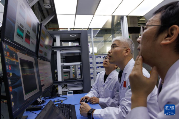 1月26日,实验站负责人、副研究员李岗,中国科学院电工研究所研究员刘建华、中国科学院电工研究所博士后周本哲(从右至左)在位于北京怀柔的中国科学院物理研究所综合极端条件实验装置极低温强磁场量子振荡实验站讨论全超导用户磁体的运行情况。新华社记者 金立旺 摄