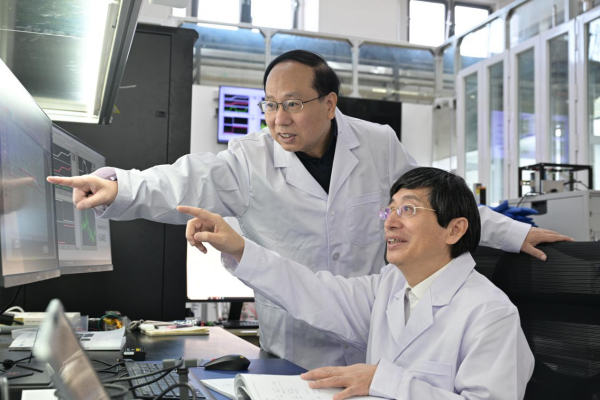 王秋良院士(右)与雒建林研究员讨论数据
