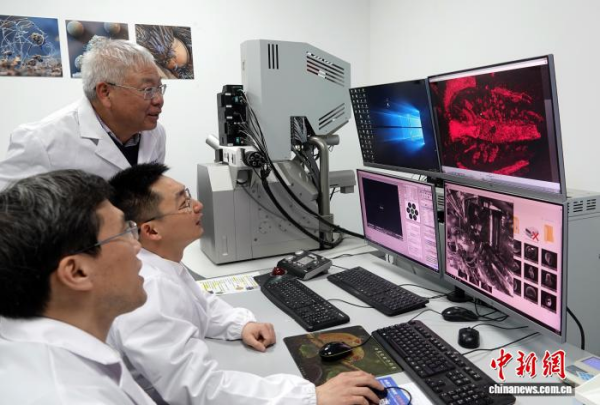 中国科学院南京古生物所朱茂炎院士、曾晗副研究员、赵方臣研究员(由远及近)在实验室研讨交流。中新网记者 孙自法 摄