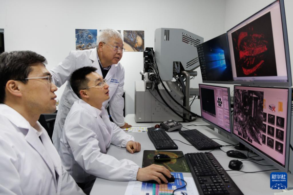 1月22日,在中国科学院南京地质古生物研究所显微CT实验室,中国科学院院士、研究员朱茂炎(右一),副研究员曾晗(左一)和同事观察扫描出来的化石图。新华社记者 金立旺 摄