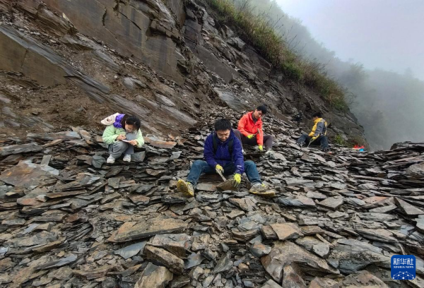科研团队在湖南省湘西土家族苗族自治州花垣县石栏镇磨子村首次野外科考中采集化石(2021年4月7日摄)。新华社发