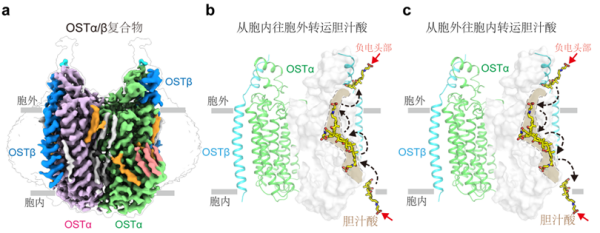 在人体消化脂肪的过程中,肝脏合成的胆汁酸首先被运输到胆囊储存,进食后,胆汁酸被分泌到肠道中通过乳化作用把脂肪分解为微胶粒。为提高消化效率,约95%的胆汁酸会被回收到肝肠循环中重复利用。在胆汁酸的肝肠循环中,有机溶质转运蛋白OSTα/β(Organic solute transporter,由α和β两个亚基组成)作为胆汁酸的关键转运蛋白,负责将重吸收的胆汁酸从肠细胞中泵入门静脉血液返回肝脏。OSTα/β属于溶质载体(SLC)蛋白家族,能够双向转运胆汁酸和固醇类物质。OSTα/β功能异常会导致消化不良、胆汁淤积及肝损伤等疾病。尽管OSTα/β在调节激素、应对压力和脂代谢中发挥关键作用,但它的组装方式及底物转运机制仍不清楚,其中一个重要原因是缺少对该转运蛋白精细结构和构象变化的直观认识。
