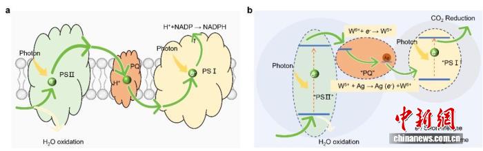 研发团队介绍说,植物通过光合作用,巧妙地将结构简单的二氧化碳和水转化为复杂的养分分子,为人类借助化学手段实现温室气体二氧化碳的资源化利用提供了自然范例。然而,人工模拟光合作用的过程仍面临科学挑战,其关键瓶颈在于:光激发功能材料所产生的电子(用于还原二氧化碳)与空穴(用于氧化水)寿命极短,难以实现二者反应的同步与持续进行。