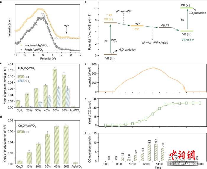 在本项研究中,研发团队模拟植物暂存光生电子的生理机制,创新设计出一种电子存储路径,通过定向设计、制备材料结构,使其能够在光照时储存电子,并在需要时精准释放,从而实现对二氧化碳与水反应速率和程度的精确调控。