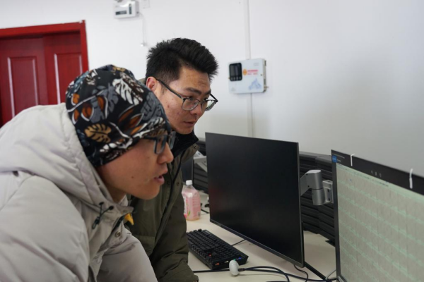 1月29日,AIMS望远镜观测员王城森(右)与同事冯宇飞在工作中交流。新华社记者 陈杰 摄