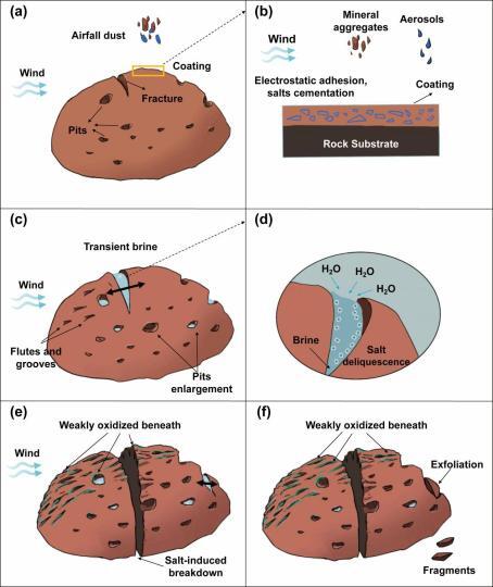 论文通讯作者刘洋研究员指出,本项研究的观测与模拟表明,火星尘埃中的盐分在岩石表面沉积和吸附,并在适宜的温湿度条件下发生潮解形成微量卤水,在后续蒸发过程中盐分重新结晶,产生的结晶压力会逐步破坏岩石结构,最终塑造了“祝融号”观测到的岩石表面纹理。