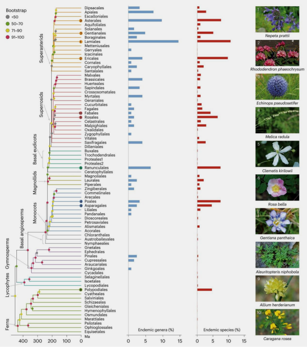 围绕这一问题,研究团队基于多年的野外调查与采集工作,构建了目前取样最全的中国维管植物生命之树,涵盖所有科、3029属(99%)、16585种(53%),其中包含6265个中国特有种。结合140余万条物种分布记录,团队从属与种两个维度,系统解析了中国维管植物的物种丰富度、系统发生多样性及系统发生特有性格局,并评估了特有中心在国家和全球保护体系中的代表性与覆盖程度。
