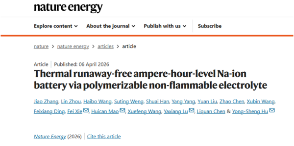 该研究以“Thermal runaway-free ampere-hour-level Na-ion battery via polymerizable non-flammable electrolyte”为题发表于《Nature Energy》