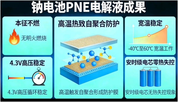 据介绍,团队创新突破传统不燃电解质仅聚焦不可燃性能的局限,研发可聚合不燃电解质(PNE),构建“热稳定性-界面稳定性-物理隔离”三位一体安全防护体系,实现从“被动阻燃”到“主动阻断热失控”的技术跨越。PNE采用三重硬核防护彻底锁死热失控风险:一是内置“冷却系统”,PNE高温下具备独特吸热分解特性,可主动抵消电池内部放热反应热量,从根源阻止热失控启动;二是采用双盐体系,分别精准保护正极、负极材料,大幅提升电极稳定性与电池循环寿命,安全与性能双向兼顾;三是设置智能“固态防火墙”,PNE拥有热自聚合特性,温度超150℃时会原位形成固态聚合物网络,防止隔膜熔化后正负极直接接触,同时阻断高温副反应与气体生成;常温下保障离子传输,高温下自动“固化”,切断风险传播路径。