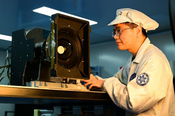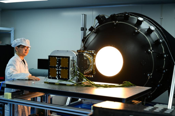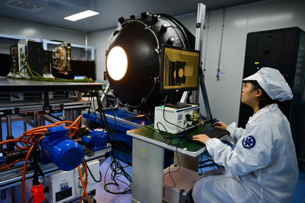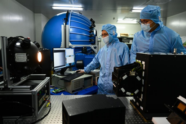 4月10日,在中国科学院合肥物质科学研究院安徽光学精密机械研究所光学遥感中心,科研人员在检查调试云和气溶胶成像仪(CAPC)。新华社记者 周牧 摄