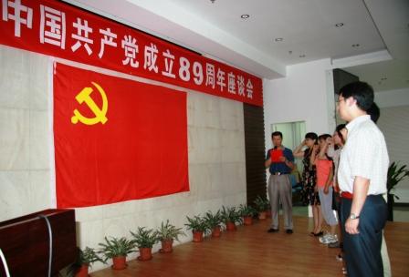 全体人员齐唱国际歌,拉开了活动的序幕。随后进行新党员宣誓,在黄勇的带领下,新入党的7位同志向鲜红的党旗发出了郑重的宣誓。接着,与会领导向党龄满50周年的老同志发放了纪念牌,并与老同志合影留念。