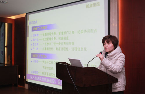 罗晓梅在报告中详细阐述了为什么要开展廉洁从业风险防控工作以及如何开展等问题,并对下一步主要工作进行了安排部署。她指出,推进廉洁从业风险防控意义重大、任务繁杂,要将廉洁从业风险防控作为完善现代院所制度的重要抓手,与加强内部控制规范建设和信息化建设等相关工作紧密结合、协同推进。针对研究所管理中发现的问题和薄弱环节,要进一步完善对策措施,确保廉洁从业风险防控工作任务落到实处。要以高度负责的态度,扎实推进廉洁从业风险防控工作,不断提升反腐倡廉建设水平,为研究所“一二五”规划和“创新2020”的实施提供更加有力的保障。