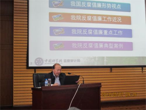 李定作了题为《坚持廉洁守净土,防控风险促创新》的报告,重点阐述了我国反腐倡廉形式、中科院反腐倡廉工作近况、中科院反腐倡廉工作重点和中科院反腐倡廉的典型案例。对廉洁从业风险防控的目的意义、实施步骤作了详细的介绍。