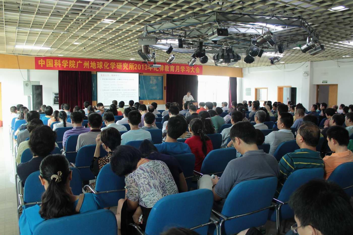 9月9日,中科院广州地球化学研究所召开全所职工大会,进行以“严纪律、正作风、促廉洁”为主题的2013年纪律教育学习月活动。所党政领导班子全体成员、全体在职职工近200人参加。会议由党办主任赵劲松主持。
