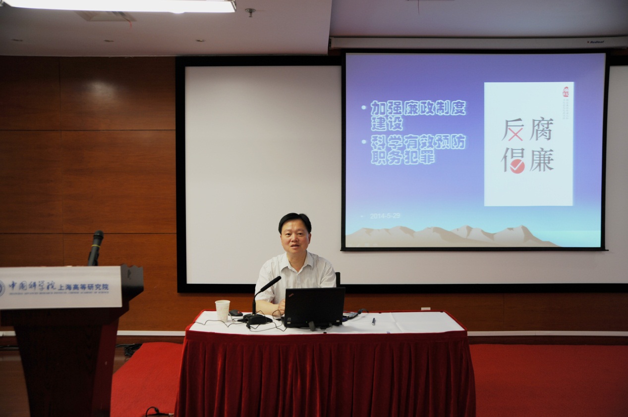 为提高中国科学院上海高等研究院职工的法制观念与拒腐防变的意识,营造风清气正的科研环境,5月29日上午,中国科学院上海高等研究院纪委特邀上海市浦东新区检察院检委会专职委员、职务预防犯罪处处长俞伟作科技系统预防职务犯罪讲座。讲座由上海高研院党委副书记、纪委书记王立根主持,上海高研院党委委员、纪委委员、各支部书记、支部委员、机关全员、副研及以上人员聆听了此次讲座。