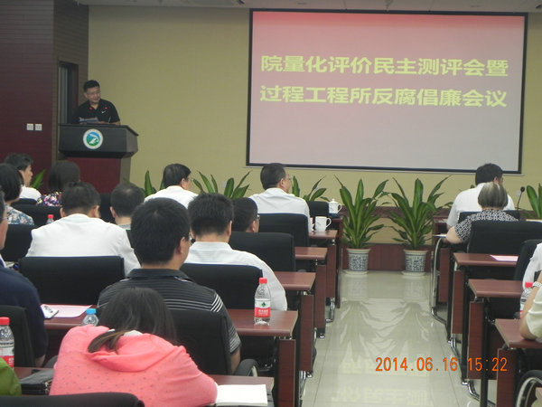 根据中科院监审局统一部署,6月16日,京区党委副书记、纪委副书记肖建春等一行五人组成考评组,对过程工程研究所进行两年一度的反腐倡廉量化考核。所领导班子成员以及党委委员、纪委委员、科技骨干、职能部门全体人员、党支部书记及副书记、纪监审干部、所属公司负责人、职代会主席团成员、工会分会主席等150余人参加了会议。过程工程所抓住这一契机,结合召开2014年度全所反腐倡廉工作会议,推动党风廉政建设和反腐败工作深入发展。