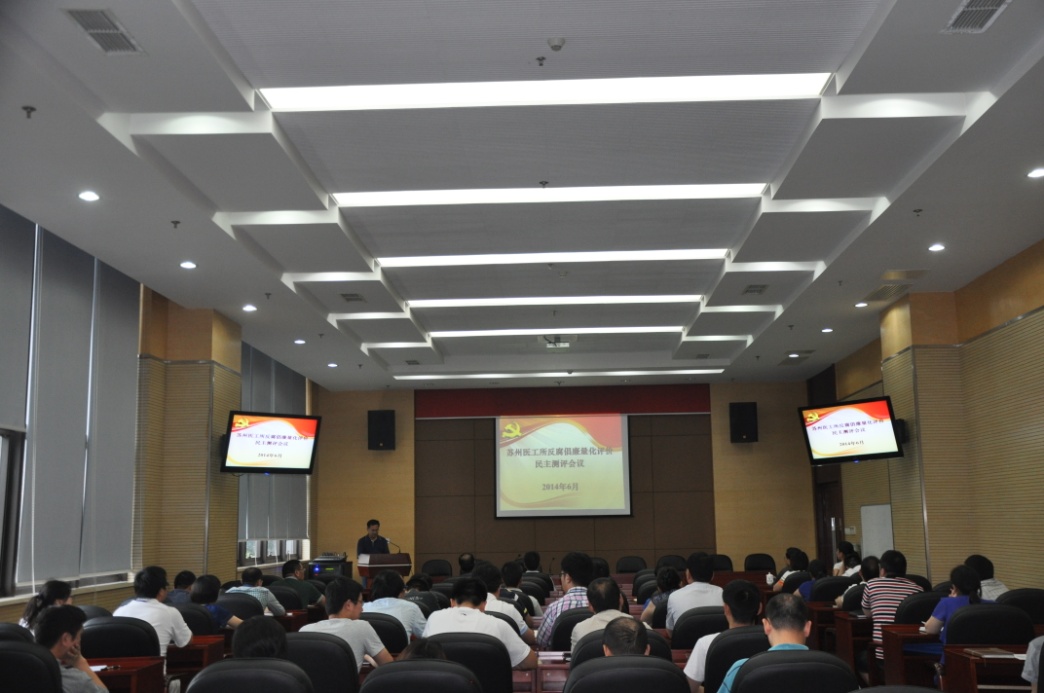 6月25日下午,中国科学院南京分院对苏州生物医学工程技术研究所反腐倡廉工作进行量化评价。苏州医工所所领导、党委委员、纪委委员、党支部委员、各部门负责人、副研及以上职称人员、纪监审干部、职代会代表等50余人参加了民主测评会议。会议由中科院南京分院副院长、纪检组组长、南京分院反腐倡廉量化考评工作组组长杨涛主持。