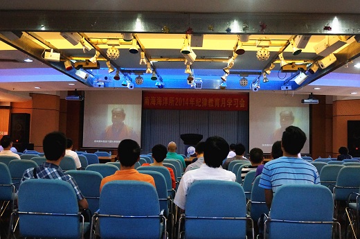 8月29日,中国科学院南海海洋研究所组织观看纪律教育月专题教育片,开展纪律教育月学习活动。所党政班子成员、纪委委员、所属各部门负责人、学科组长、党支部书记等60余人参加了学习会。