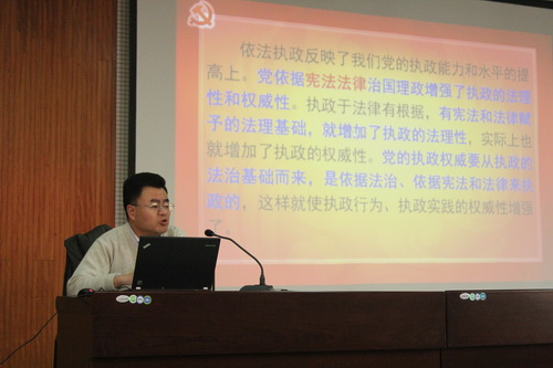 郭云甫在报告中系统详实地介绍了全面推进依法治国的重大意义、政治方向、任务举措及根本保证。并深入浅出的从坚持走中国特色社会主义法治道路、建设中国特色社会主义法治体系,完善以宪法为核心的中国特色社会主义法律体系、加强宪法实施,深入推进依法行政、加快建设法治政府、提高司法公信力,增强全民法治观念、推进法治社会建设,加强法治工作队伍建设等方面,全面准确、科学严谨地阐释了党的十八届四中全会精神。