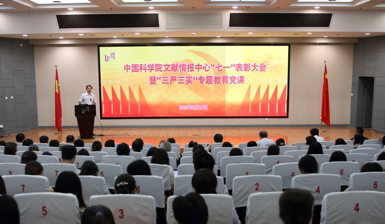 6月29日下午,中国科学院文献情报中心召开“七一”表彰大会暨“三严三实”专题党课,京区党委二片组织员陈树堂、北京分院行政管理处副处长李凤霞参加,文献中心全体党员250余人参加了大会。会议由党委书记何林主持。