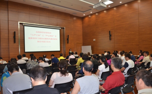 7月21日,中国科学院自然科学史研究所举行以“严以用权”为主题的“三严三实”专题教育学习报告会暨党风廉政建设责任书签订仪式。所长张柏春、副所长韩琦、学术委员主任罗桂环、工会主席刘益东以及党委委员、纪委委员和全体职工参加了大会,会议由党委书记袁萍主持。