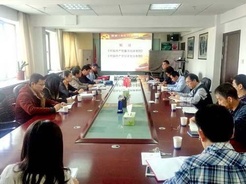 11月17日下午,中共中国科学院寒区旱区环境与工程研究所党委召开了党支部书记会议,对“三严三实”专题教育民主生活会和组织生活会进行了提前部署安排。会议对新修订的《中国共产党廉洁自律准则》(以下简称《准则》)和《中国共产党纪律处分条例》(以下简称《条例》)进行了学习,对《中国科学院关于落实全面从严治党要求实施方案》和《中共中国科学院党组贯彻〈中国共产党统一战线工作条例(试行)〉实施细则》两个重要文件精神进行了传达。寒旱所十五个党支部的支部书记和支委参加了学习研讨。会议由党委副书记(主持工作)、副所长张小军主持。