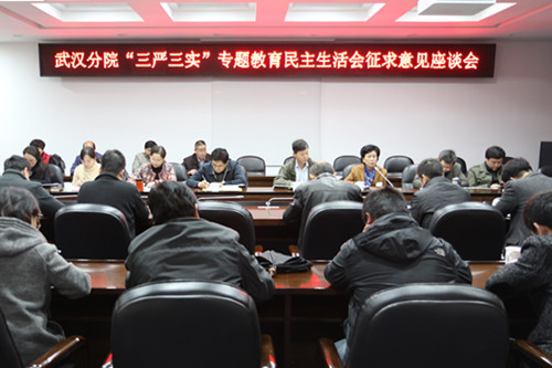 在抓好各单位专题教育民主生活会的同时,武汉分院领导班子扎实做好自身“三严三实”专题教育民主生活会的准备工作,印发了《关于武汉分院开展“三严三实”专题民主生活会深入群众征求意见的通知》,通过召开座谈会、设置意见箱等多种形式收集群众提出的意见和建议。11月2日至19日,武汉分院先后组织召开5个座谈会,紧扣践行“三严三实”,广泛听取各单位科研骨干、党外代表人士、离退休支部书记、机关在职人员和机关离退休人员等各类人员的意见建议。武汉分院领导班子成员认真听取了党员群众对领导班子及成员在“不严不实”方面存在的问题的反映,以及对“率先行动”计划实施、分院系统科研工作的交叉联合、扩大中科院在地方影响、园区建设规划、生活配套设施建设、机关自身建设等各方面的意见建议,并就相关工作与大家进行了沟通交流。